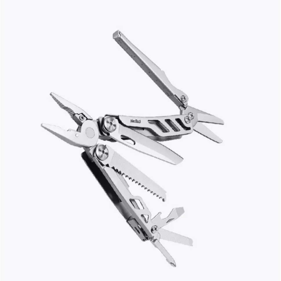 мультитул NexTool з комплектом із 9 змінних біт; кількість функцій – 14; матеріали – нержавіючі марки сталі 80Cr14MoV, 30Cr13, 420J2; розміри у складеному вигляді – 109.3 x 38.9 x 22 мм; вага – 245 г; у комплекті є чохол для зберігання.