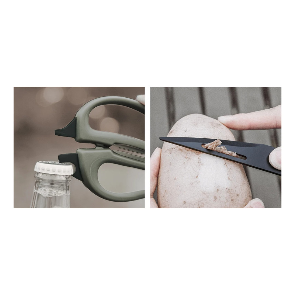 набір кухонних приборів NexTool для приготування їжі на природі; кількість приборів – 6 шт; матеріал ножа – сталь 3Cr13, PP; матеріал ножиць – сталь 3Cr13, PP; матеріал щипців – сталь 301 (12Cr17Ni7); матеріал паличок для їжі – сталь 304 (06Cr19Ni10); матеріал ложки та лопатки – силікон, нейлон; у комплекті є сумка-органайзер з нейлону.